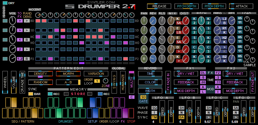 The plugin generates a pattern of two 16-step sequences in real time. You can change the rhythmic pattern on the fly, not only by switching rhythmic patterns, but also smoothly by changing parameters such as "morphing", "density" and others. Also, version 2.7 now has the ability to remember many editable settings for each pattern.