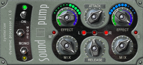 Sound Pump is a semi-automatic dynamic processor. Depending on the settings, it can operate as a compressor or as an expander. Unlike classical compressors, the user does not need to set the threshold and compression ratio. Only the EFFECT and MIX levels are adjustable. In addition, ATTACK and RELEASE values are also adjustable. Despite the ease of operation, Sound Pump really pumps up the sound.