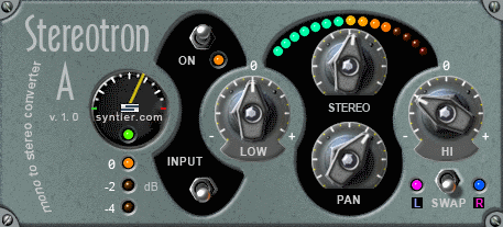 Stereotron A is a pseudo-stereo processor. It works according to the classical principle of dividing a mono signal into many frequency bands and panning them. Stereotron A can be used to give stereo space to mono tracks when mixed. The plugin has full mono compatibility. The device is very simple and does not need a thick manual.